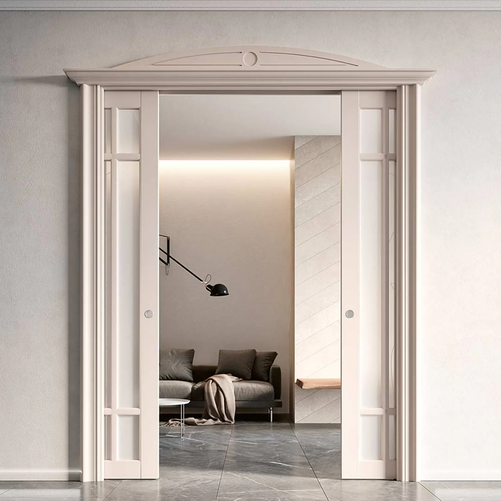 1. Porte Coulissante Double à l'intérieur du mur : Ce type implique que les portes coulissent à l'intérieur d'un coffrage muré. C'est une solution idéale pour ceux qui souhaitent une continuité visuelle complète entre les pièces sans que les portes ne soient visibles une fois ouvertes. La porte coulissante double à l'intérieur du mur offre un design propre et minimaliste, parfait pour des espaces modernes.