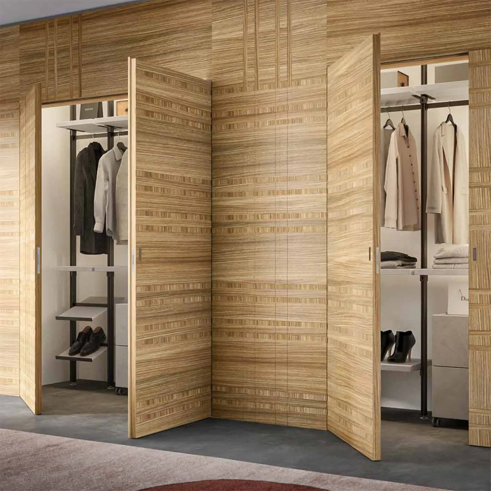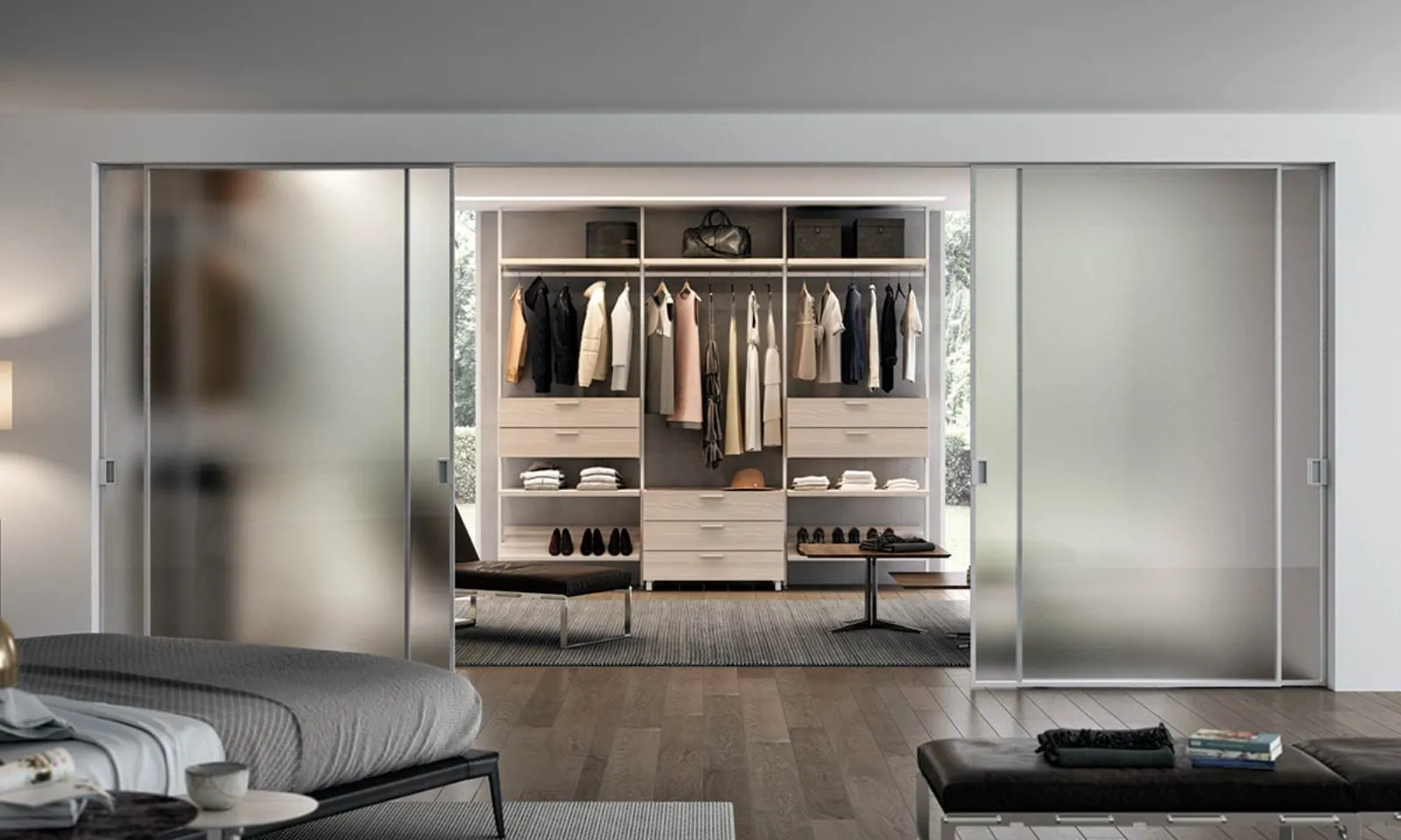 Les portes des placards peuvent être réalisées avec différents matériaux, comme le verre et l'aluminium pour un look contemporain, ou séparées par des élégantes boiseries en bois ou laquées pour une touche plus classique et élégante.